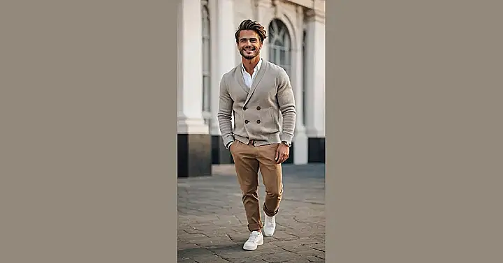 This guy’s got fall fashion down to a science! He’s rocking a comfy-looking cardigan, perfect for those crisp autumn days when you want to look sharp but still be cozy. Those khakis are super classic and go with just about anything, and the white sneakers add a touch of casual cool. This outfit is the perfect balance of trendy and timeless, and it’s totally something you could wear to school, hang out with friends, or even grab a coffee with your parents!
