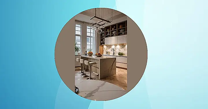So, picture this: you walk into this kitchen and BAM! That marble countertop is like a piece of art – it’s so fancy, it’s practically wearing a tiny top hat. And check out those cool glass lights hanging down. Forget cooking, you could practically throw a mini disco party in here, right? With a kitchen this chic, even burning toast becomes a stylish *faux pas*!