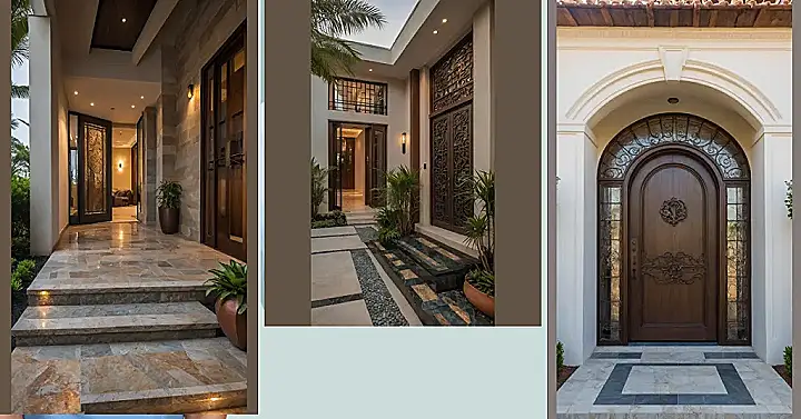 Walking up to this place feels like you’re about to get VIP access to something super cool. Look at those fancy steps and the shiny floor leading to the door! This isn’t just any old door you sneak out of for late-night snacks; this is the main entry, practically rolling out a stone carpet for your arrival. It’s so grand, you half expect a fanfare to play when you ring the doorbell, or maybe just a really confused delivery person trying to find the service entrance.