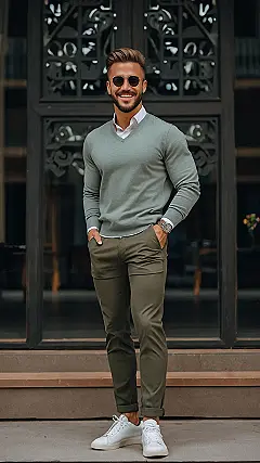 **Paragraph 1:** Hey dudes! Check out this seriously cool outfit – it’s the perfect example of “men’s smart casual outfits.” This guy’s rocking a sage green sweater (it’s like a sophisticated army green!) over a crisp white shirt. See how the collar peeks out? That’s a subtle detail that makes the whole look way more stylish. He’s paired it with olive green chinos (think fancy cargo pants but way cooler) and some super clean white sneakers. The whole thing is effortlessly stylish – like he just threw it on, but actually spent, like, five minutes thinking about it. It’s the kind of outfit you could wear to a nice restaurant or hanging out with friends—so versatile!