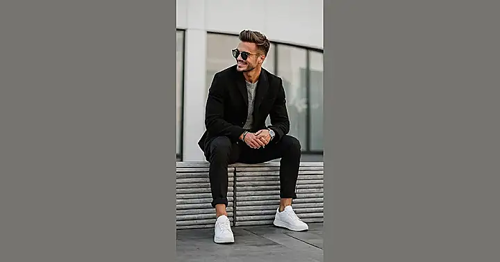 Hey there, fashion-forward friend! Check out this guy. He’s rocking the “mens smart casual outfits” look like a boss! See that black blazer? It’s like the superhero cape of casual cool. Paired with those sleek black pants and crisp white sneakers, he’s basically ready to conquer the world…or at least, ace that Friday night hangout. He’s proving that smart casual doesn’t mean boring – it’s all about looking sharp without looking like you’re headed to a job interview. This is what we call effortless style – the kind that makes you look good without even trying too hard!