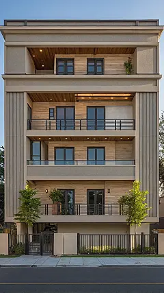 This awesome building is totally showing off its “front elevation design,” which is like the fancy outfit it wears for the whole street to see. It’s not just a boring box; this place has layers, cool textures, and even some wood trim that makes it look super modern and inviting. Getting the front look just right is a huge deal, kind of like choosing your best filter for a photo – you want everyone passing by to think, “Wow, that building looks sharp!”