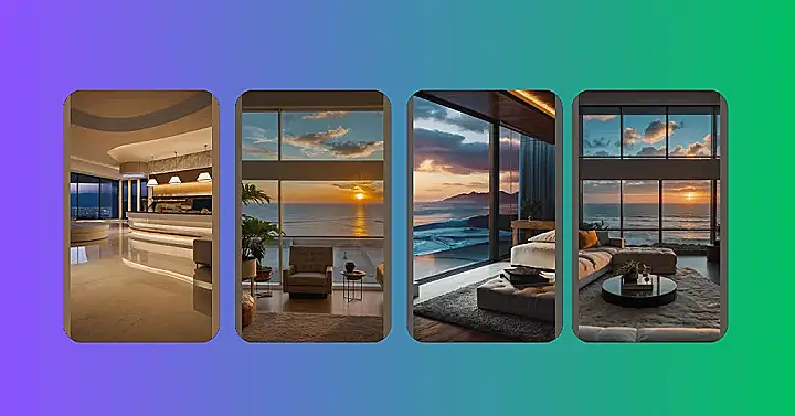 This room is like a dream! It’s got that cozy, calming feeling, with big windows showing off a stunning ocean sunset. You can practically feel the cool breeze coming in, and the fluffy rug looks like it would be amazing to sink your toes into. It’s so comfy, you might just want to grab a book, curl up on the couch, and forget all about the world outside.