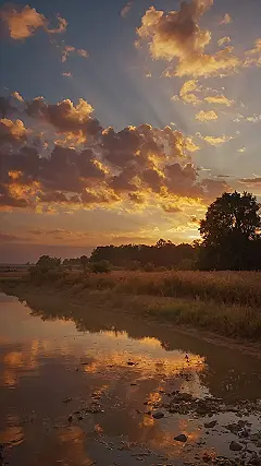 This picture is like a painting that the sky made itself! Look at those clouds, they’re like big fluffy brushes dipped in orange and pink paint. The sun is saying goodbye for the day, and it’s leaving behind a beautiful show of colors. Even the river is getting in on the action, reflecting the colors of the sky like a giant mirror.