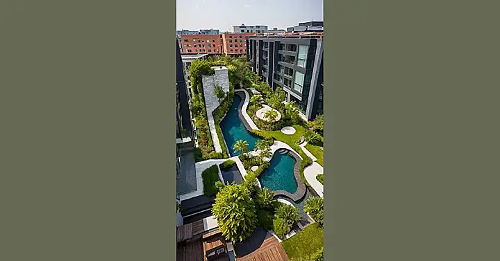 Check out those pools and all that lush green stuff! It’s not just random plants thrown around; it’s all planned to look super cool and inviting. Imagine escaping here after a long day of classes or trying to figure out quadratic equations – you could just find a comfy spot by the water or walk along those neat paths. It’s proof that making cities look awesome isn’t just about towering buildings, but also about creating secret garden-like places where you can actually breathe and maybe even spot a bird or two, probably looking for a snack break from the urban jungle.