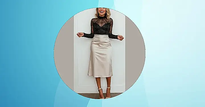 This outfit is the perfect blend of fancy and fun—like a sparkly snowflake that’s also secretly a ninja. That gorgeous beige satin skirt flows like liquid sunshine, and it’s paired with a black lacy top that’s totally mysterious and chic. Imagine yourself twirling on the dance floor, feeling like a total queen (or king!). It’s the kind of outfit that makes you feel confident enough to sneak an extra cookie or two without anyone noticing.