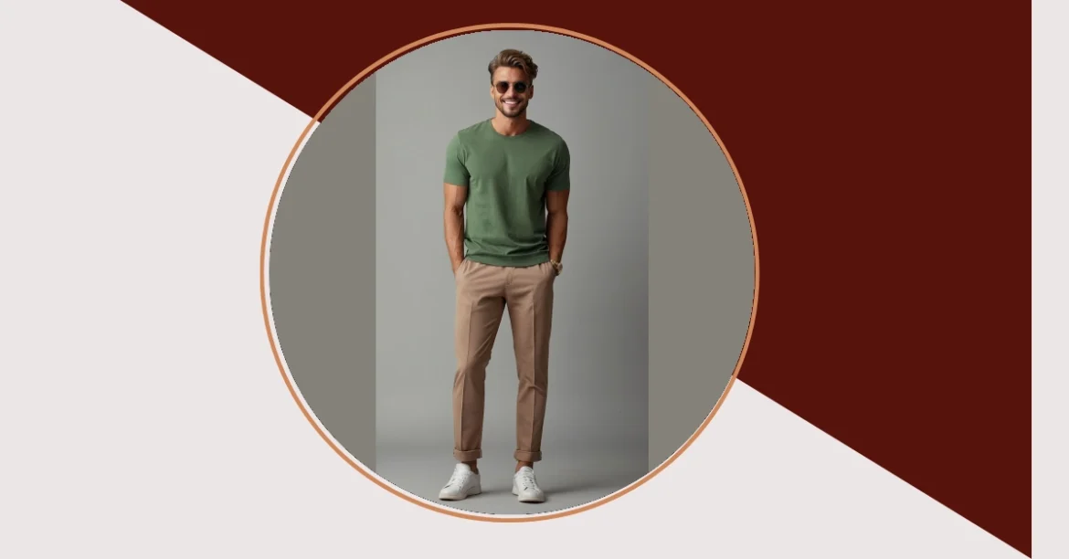 Summer’s here, and you need to ditch those heavy jeans! This outfit is like the chill version of a suit. The olive green tee is like a comfy hug for your torso, and the khaki pants are way more breathable than anything you wore all winter. Plus, you can totally wear this to a BBQ, a date, or even just chilling at the mall trying to find the perfect ice cream flavor.