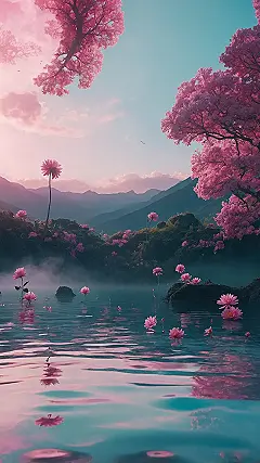 This picture is like June decided to throw a giant, beautiful party and everyone got invited! Look at those crazy pink trees reaching for the sky like they’re high-fiving the clouds, and the little pink flowers chilling on the water like they’re having a fancy pool day. It’s got misty mountains in the background, making it feel super peaceful, the kind of place you’d want to escape to when school gets boring.