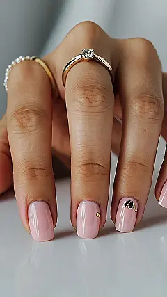 These nails are softer than a kitten’s purr! Imagine snuggling up by the fireplace with a hot chocolate, and your nails are perfectly matching the cozy vibes. That delicate pink is like a winter sunset, all warm and dreamy. And those tiny gold and black accents? They’re like the sparkly snowflakes that add a touch of magic to a winter wonderland— without the shivering!