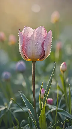 This fabulous tulip totally understands the concept of a calm morning. It woke up looking like it just finished a relaxing spa treatment, covered in tiny sparkling water droplets that are way better than any glitter. Standing tall in the soft sunlight, it’s clearly not rushing anywhere, just soaking up the peaceful vibes and showing off its natural morning bling. It’s the ultimate inspiration for starting your day slow and sparkly.