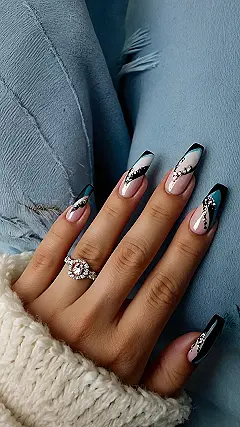 These nails are so fancy, they make even the coldest winter day feel like a glamorous holiday party! With their icy blue, sparkly white, and black accents, they’re like mini snow globes for your fingertips. Imagine how amazing they’ll look with a warm cup of hot cocoa and a good book. Plus, they’re so chic that even your friends will be jealous!