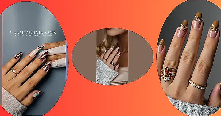 Look at those nails! They’re like little pieces of art, all sparkly and pretty. The brown and gold colors remind me of those yummy gingerbread cookies we eat around the holidays. And those sparkly rings? They’re like icing on the cake! These nails are ready to take on the chilly weather and look awesome doing it.