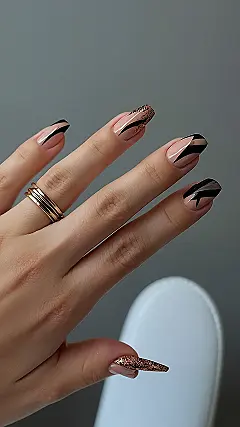 Hey there, future nail artists! Check out these super-stylish nails – they’re like a minimalist masterpiece, but way more fun. Imagine a super-chic beige base, then BAM! Swanky black stripes and a tiny sprinkle of glittery gold. It’s like modern art, but for your fingertips. You could totally rock these to school, a party, or even just chilling with your friends. No need for crazy complicated designs; less is definitely more when it comes to these trendy nails! They’re stylish, sophisticated, and totally Instagram-worthy.