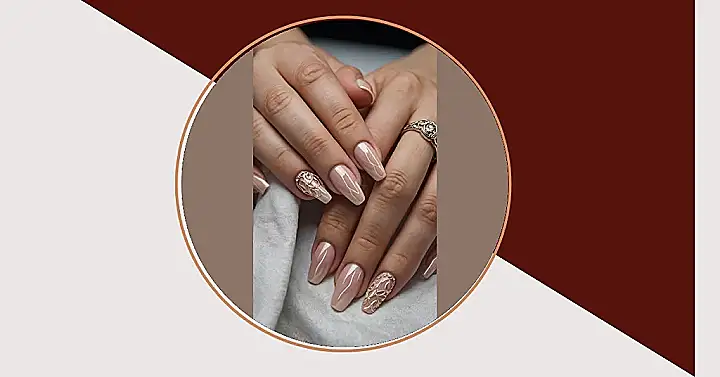 Looking at these nails, you see how you can rock summer without needing sunglasses just to look at your hands. That beautiful, almost glowing base colour is like your skin after a perfect day outside, and those cool, swirly lines make you think of waves or maybe just really cool abstract art you’d see in a trendy cafe. Plus, check out that one finger with the fancy, lace-like design! It’s like adding a little bit of sparkly treasure to your fingertip. These are definitely the kind of nails that make you feel put-together and ready for any summer adventure, from chilling by the pool to accidentally winning a dance-off.