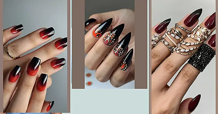 Hey everyone! Check out these awesome nails! They’re totally perfect for Thanksgiving, but with a bit of a spooky twist. It’s like a fiery sunset met a goth vampire – seriously cool, right? Imagine showing up to your Thanksgiving feast with these bad boys; you’ll be the most stylish turkey-lover at the table! The red and black ombre (that’s fancy for a gradual color blend) is so sleek and chic, and it totally works for both the autumn vibe and adding a little edge to your holiday look. They’re so cute, they’re almost scary-cute… in the best way, of course!