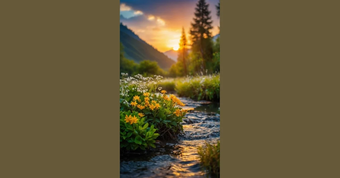Wow, look at that sky putting on a show! This photo is basically proof that nature knows how to get its glam on for sunset. Those little yellow flowers by the water look like they’re literally basking in the spotlight, probably whispering secrets to the flowing stream about how fabulous they are. It’s the kind of scene that makes you pause and think, “Okay, maybe scrolling isn’t *everything*.”