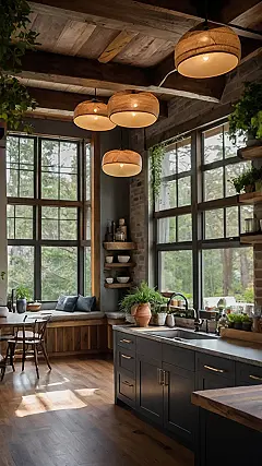 This kitchen isn’t your grandma’s – unless your grandma had amazing taste and a serious green thumb! Imagine a cozy cabin, but instead of roughing it, you’ve got sleek dark cabinets and a gorgeous wooden island perfect for baking cookies (or maybe just admiring the view). The hanging plants add a touch of jungle vibes, making you feel like you’re cooking in a secret treehouse. It’s the perfect blend of modern convenience and old-fashioned charm; Who needs fancy gadgets when you have sunshine streaming through those amazing windows?
