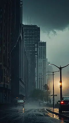 This picture is like a scene from a rainy day movie! Imagine: you’re curled up on the couch, sipping hot cocoa, and watching the rain lash against the city windows. This wallpaper captures that feeling perfectly – those tall buildings looking all mysterious and dark under the stormy sky, the cars splashing through puddles, and that beautiful, moody light. It’s the ultimate “stay inside and read a book” kind of vibe.