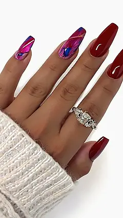 This is not your average “red fall nails” look! These nails are like a work of art. They’ve got a touch of red, a splash of pink, and a hint of blue. It’s like a colorful explosion on your fingertips! The red nails are classic and bold, but the pink and blue nails are the real showstoppers. They look like tiny abstract paintings, but with a touch of glitz. Who needs a canvas when you can have your nails as a masterpiece?