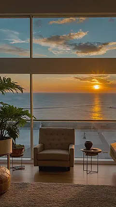 Imagine waking up to this view every morning! This comfy living room with its huge windows is like a giant picture frame for a breathtaking sunset over the ocean. You could spend all day just watching the waves roll in and the sky change colors. Plus, with a giant, fluffy rug and super comfy couch, you could totally curl up with a good book and just chill out all day. It’s like the perfect room to escape from the stress of the world and just enjoy the beauty of nature.