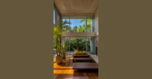 Check out this place! It looks like a giant, friendly concrete tree is showing off its awesome branches, providing shade for a secret garden party happening right in the middle of the city hustle. Those massive grey beams aren’t just there for structure; they’re creating cool shadows that dance on the floor, making the whole area feel like a special escape pod where leafy green things and sturdy stone decide to be best buds. It’s like the building itself is giving nature a big hug!