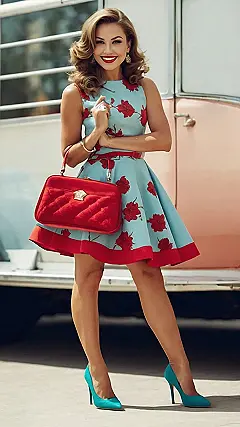 **Paragraph 1:** Wowza! Check out this totally awesome retro look! This girl is rocking a dress that screams “50s diner” but with a modern twist. The light blue with red flowers is super cute, and that red belt and matching handbag? Perfection! It’s like she stepped out of a vintage movie, but those teal shoes totally keep it fresh. Imagine cruising in a convertible with this outfit – instant head-turner! Seriously, who wouldn’t want to try out this totally stylish retro vibe?