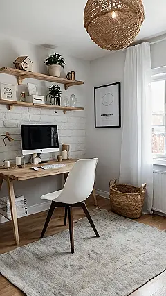 This picture screams “Scandinavian home decor” – imagine waking up every day to this calm and cozy workspace! The white brick wall adds a touch of rustic charm, while the wood furniture and natural light make you feel like you’re working in a peaceful forest. But don’t get too comfortable, because that sleek computer isn’t going to work itself! It’s a good thing that cool lamp is there to help you stay focused on those homework assignments.