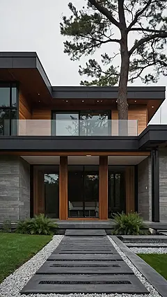 This house is like a fancy treehouse, but with way more style! It’s got all the modern, minimalist vibes, but with a twist. Imagine walking in and seeing a big, open space with tons of windows, letting in all the sunshine and fresh air. The wood floors are super smooth, making you feel like you’re walking on clouds, and the walls are simple but sleek, giving the whole place a calming feel. It’s kind of like a zen garden for your home!