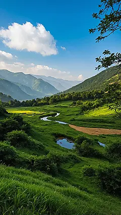 Walking up that little path looks like a scene straight out of a fantasy movie, or maybe just your next profile picture background. Seriously, look at those mountains peeking through the fluffy, misty clouds like shy giants. It’s so ridiculously green and peaceful, you half expect squirrels to start helping you carry your backpack. This is definitely the kind of beautiful nature landscape that makes you forget about homework for a while.