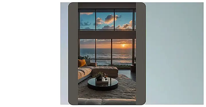 This room is like a dream! It’s got that cozy, calming feeling, with big windows showing off a stunning ocean sunset. You can practically feel the cool breeze coming in, and the fluffy rug looks like it would be amazing to sink your toes into. It’s so comfy, you might just want to grab a book, curl up on the couch, and forget all about the world outside.