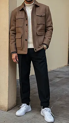 Hey there, fashion-forward fellas! Forget the frumpy winter coats your grandpa used to wear. This guy’s rocking a seriously cool streetwear look that’s perfect for battling the winter chill while still looking like a million bucks. Notice the stylish beige coat – it’s warm enough to keep the snow off your nose, but it’s still modern and sleek. He’s even got a cool sweater and scarf combo going on. This look proves you can stay comfy *and* stylish, even when the temperature drops lower than your social media likes!