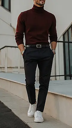Want to look like you’re ready to negotiate a peace treaty or star in a spy movie, but also totally cool grabbing pizza with your friends? This outfit is the answer. Rocking a turtleneck sweater with dress pants is like saying, “I have a meeting at 4, but I’m still down for a round of Mario Kart at 6.” The dark colors make you look sleek, and the tucked in shirt with a belt means you’re taking this seriously!