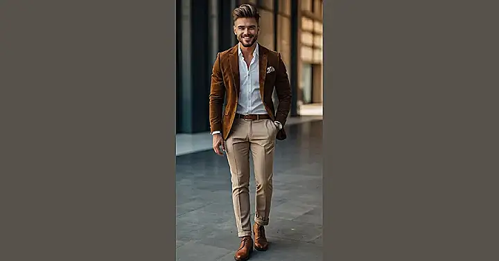 This style is all about looking good without trying too hard, or feeling too uncomfortable. The mix of colors, like the dark brown with those khaki pants, is like a secret recipe for a great outfit. And notice the little details, like the watch and the cool pocket square, making this a super stylish and classy outfit for men. This look is so cool, it might even get you extra credit points, or at least some serious style points.