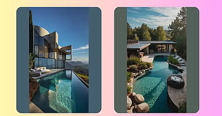This house is so fancy, it probably has a butler who brings you ice cream while you’re floating in the pool! Imagine being able to just chill on that comfy-looking lounge chair and soak up the warm evening air. It’s like a scene straight out of a movie!