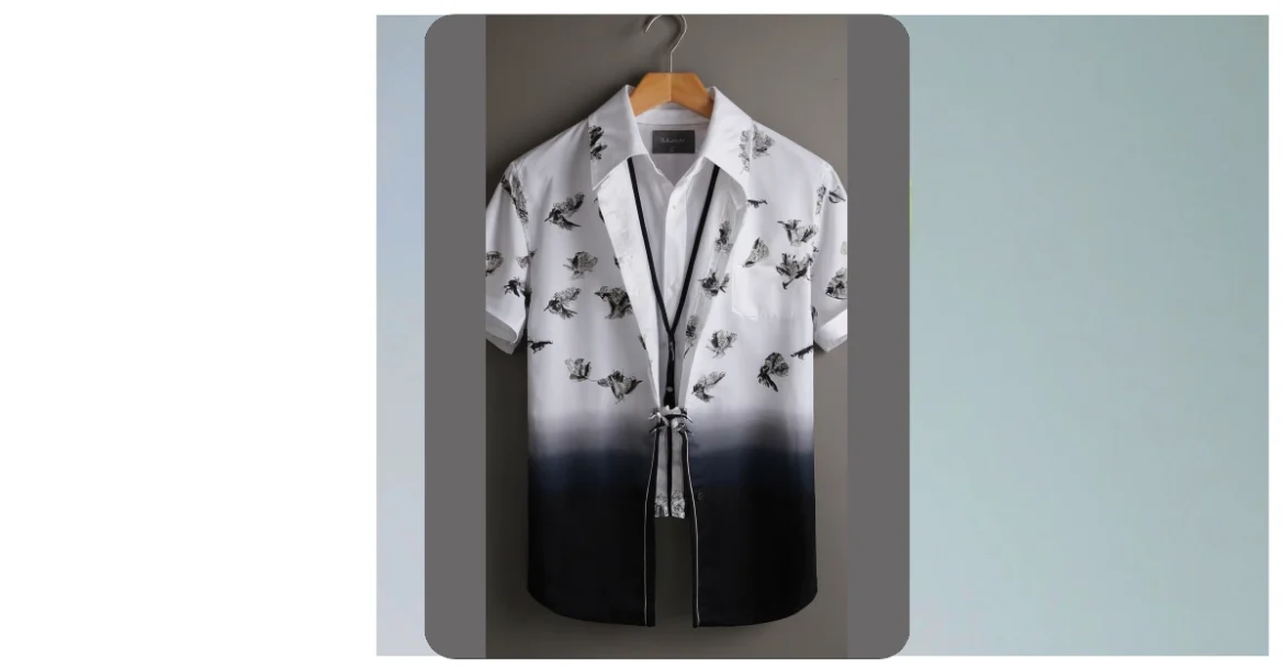 This shirt is like a magic trick! At the top, you’ve got these cool black and white flowers, almost like little doodles. Then, it fades into this awesome dark color at the bottom, like the sun setting on a perfect summer day. If you want a shirt that says “I’m chill, but I also put some thought into my outfit,” this could be your new go-to summer jam.
