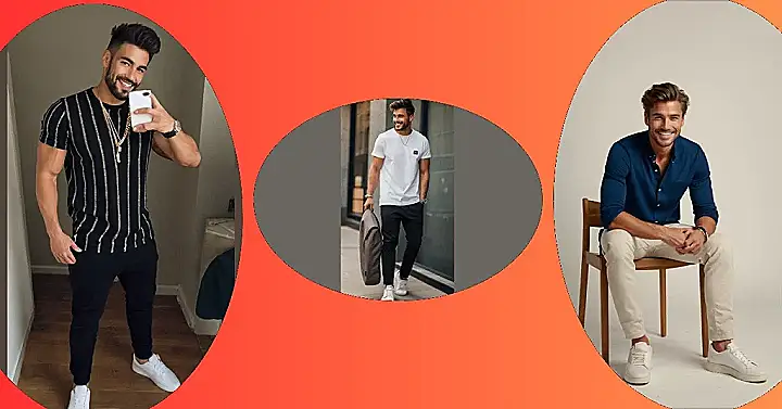 This guy is rocking a classic men’s t-shirt outfit that’s perfect for a day at school or hanging out with friends. He’s got a comfy t-shirt that looks like it’s perfect for both looking sharp and feeling relaxed. The white pants are a great choice because they go with everything and the white sneakers add a cool, sporty vibe. He’s clearly got the whole “effortless cool” thing down, and you can too!