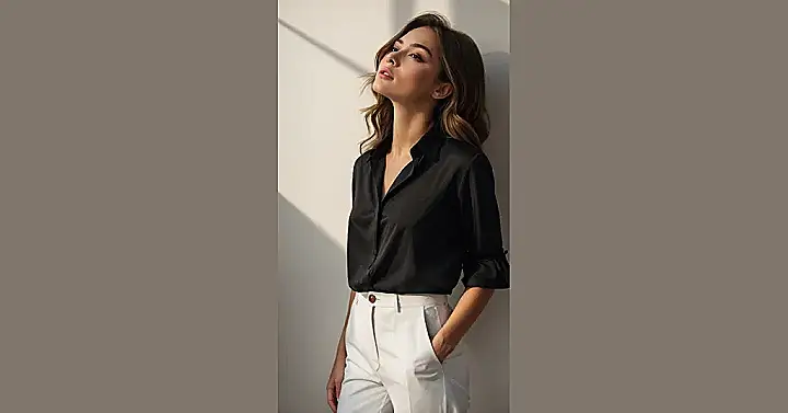 Having this image on your screen is like having a silent fashion advisor who also happens to be a pro at posing dramatically in good lighting. She’s giving off major cool vibes in her black shirt and white trousers, probably wondering if you’re ever going to delete those blurry selfies. She makes for a cool background that’s way better than that generic landscape photo everyone else uses!