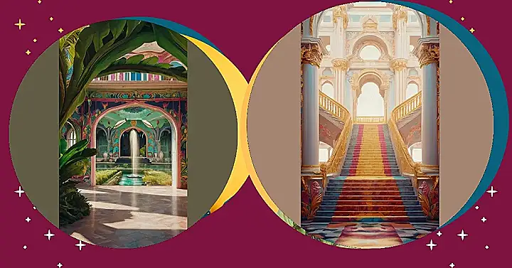 Imagine hanging this up in your bedroom – instant royalty! With all those golden columns and sparkly chandeliers, you could practically charge admission to your friends. Just make sure you have some fancy snacks on hand, like maybe gold-dusted chips or diamond-shaped cookies, to really sell the “palace life” vibe. No one needs to know you’re still rocking that beanbag chair under the chandelier!