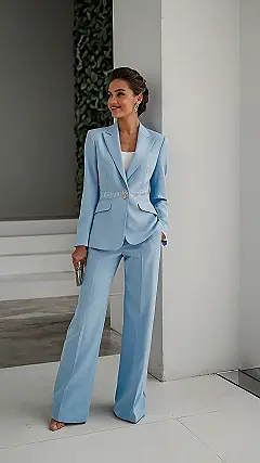 **Paragraph 1:** Check out this totally awesome baby blue suit! It’s like something a super stylish secret agent would wear, only instead of fighting villains, she’s probably acing a big presentation or landing that dream job. The wide-leg pants are seriously chic, and those little flower details on the cuffs add a fun, unexpected touch. Forget boring old black suits – this one says, “I’m confident, I’m cool, and I’m ready to take on the world… in style!” It’s the perfect example of how “women in suits” can be both powerful and playful.