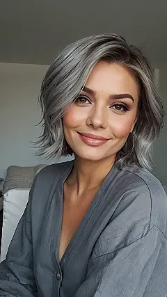 This cool chick is rocking a super stylish grey bob, and let me tell you, she’s totally owning it! Grey hair isn’t just for grandma anymore, it’s a totally trendy and modern look. This bob hairstyle is short and chic, like a cool city girl vibe. It frames her face perfectly, showing off those amazing cheekbones and bright, beautiful eyes. The silver shade is super trendy and adds a touch of rebellious cool to her look.