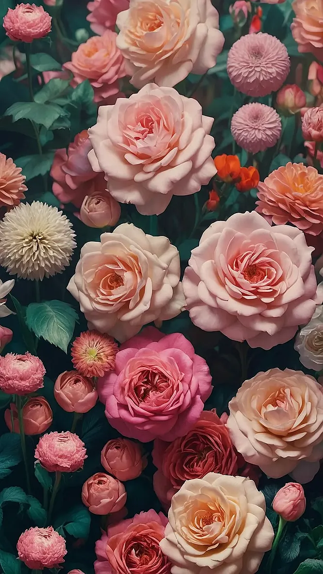 This image is like a party for flowers! There are so many different kinds, all looking amazing. They’re like a bunch of friends who decided to wear their best outfits for a big celebration. Some of them even have a little bit of sparkle on their petals, which makes them look extra fancy. It’s like they’re ready to take over your phone screen and make it extra pretty.