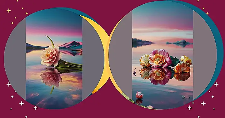 Imagine a bunch of flowers floating in a still pond. It’s like looking into a magical mirror! The flowers, with their bright colors and delicate petals, are perfectly reflected on the surface of the water. It’s like someone took a picture of them and then flipped it upside down, creating a mirror image! This image makes you feel peaceful and calm, just like looking at a beautiful sunset.