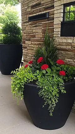 Check out the plants chilling in that big pot – they look like they’re ready for a show! You’ve got those bright red flowers totally stealing the spotlight, some tall spiky greens acting like cool bodyguards, and trailing vines trying to hang loose over the edge. Planters for your front porch let you create these cool plant arrangements that shout “Welcome!” and make your entryway feel super lively and happy without needing a green thumb degree. It’s like instant garden vibes delivered right to your door!
