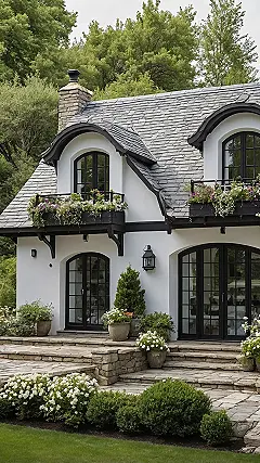 This white cottage is basically showing off. Look at it, all clean and bright, like it just stepped out of a fancy magazine cover. The white walls are so perfect you’d be scared to even breathe near them, imagining a rogue mud splatter ruining everything. And don’t even get me started on those black-framed windows and doors – they look like they’re guarding secrets, probably just secrets about how to get flowers to look that ridiculously happy on a balcony without constant watering. It’s the kind of place where even the squirrels probably wipe their feet before approaching.