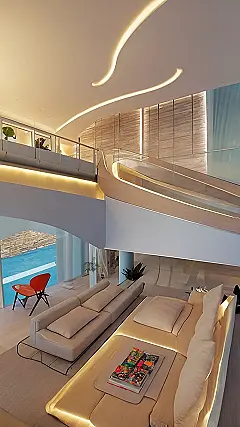 This living room looks like a spaceship! It’s so futuristic and cool, it’s like stepping into a sci-fi movie. The curved ceiling and the sleek, white furniture make it feel like you’re floating in space. And the warm glow of the lighting makes it extra cozy, like a little spaceship hug.