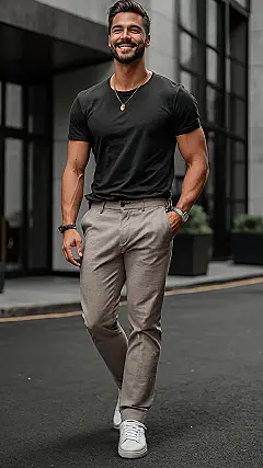 This guy knows how to rock a simple but stylish outfit. He’s got on a classic black tee, which is perfect for any occasion. It’s like the comfy, reliable friend you can always count on. And those tan pants? They’re like the cool, confident side of his personality, adding a touch of sophistication without being too fancy. Think of it as the ultimate chill vibe: comfy, stylish, and ready for anything!