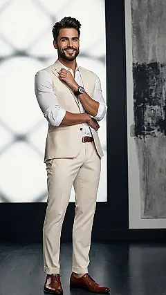 Putting on sharp formal clothes isn’t just about looking good for others; it’s about feeling ready for anything, or at least feeling like you could totally ace that formal class presentation. That light-colored suit vest combo? It’s not your super-serious dark suit trying too hard. It’s relaxed but still totally sharp, making the guy look confident and ready to smile like he knows a secret joke. Just remember to stand up straight and try really hard not to spill anything on it, especially if pizza is involved!