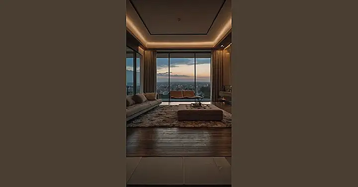 This picture shows a living room that’s seriously chill. It’s got all the right vibes for relaxing after a long day: big comfy couches, a fluffy rug, and a view of the city that’s so amazing it makes you forget all your troubles. The room is all warm and cozy, perfect for a night in with your friends or maybe even a solo movie marathon.