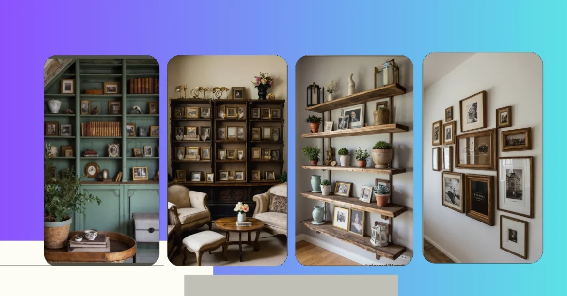 Seriously, that wall is a work of art! It’s a perfect example of a “Vintage Frame Gallery Wall,” showcasing all those old photos in a super stylish way. The rustic wooden shelves give it that extra touch of vintage charm, and the whole thing just screams “cozy living room”! I bet this room is great for telling stories and sharing memories with friends and family – that’s what makes it really special. It’s not just a pretty picture; it’s a celebration of the past.