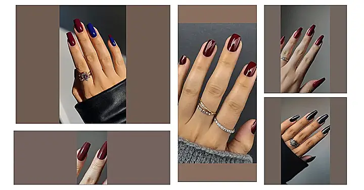 Those long, pointy nails are rocking a stunning maroon gel polish. It’s like the perfect shade for someone who wants to stand out but still be a little mysterious, you know? Like a vampire who loves to wear fancy clothes but also really loves pumpkin spice lattes.